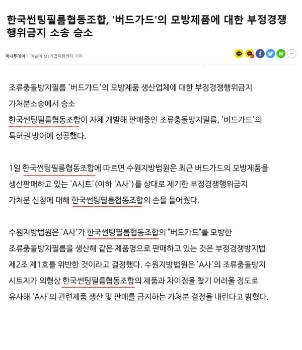 머니투데이 신문 / 한국썬팅필름협동조합, '버드가드'의 모방제품에 대한 부정경쟁행위금지 소송 승소