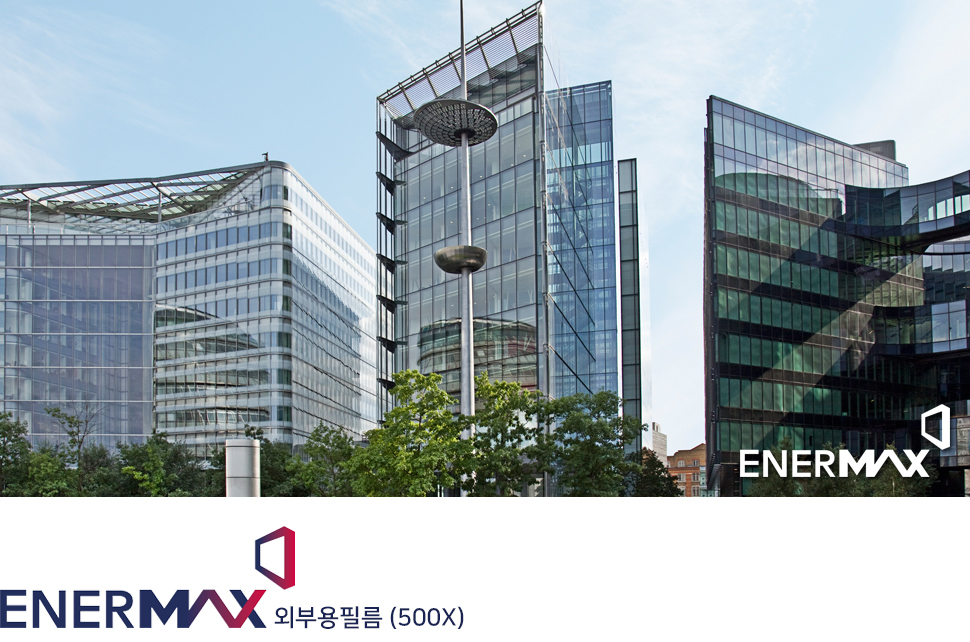 ENERMAX 500X (외부용 필름) 시리즈는 유리 외부 면에 시공하여 태양열, 섬광, 자외선 등을 차단할 수 있도록 설계되어 구조적으로 내부시공이 불가능한 건물을 위한 가장 이상적인 해결책을 제공합니다.